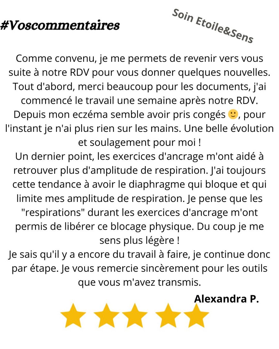 Avis de Mélanie (et Fabien) du 06/03/2024 : Bonjour Catherine, Merci beaucoup pour le bon cadeau! Fabien m'a dit à la sortie de la séance qu'il se sentait très bien et apaisé. Pour ma part j'ai dormi profondément les jours qui ont suivi et j'ose plus facilement dire ce que j'ai sur le cœur. (Quand on comprend pourquoi on agit d'une certaine façon, c'est plus simple de l'expliquer à l'autre...) Je lis la prière d'ancrage chaque jour. Je me sens déjà beaucoup plus libérée de certains poids. J'aspire à de nouvelles choses pour mon épanouissement personnel. Je reviendrais vers vous pour le soin dont vous m'aviez parlé. Je suis ravie de vous avoir rencontré, le plaisir est bel et bien partagé.