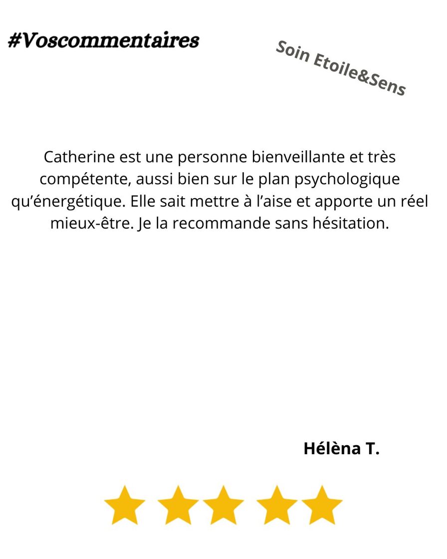Avis de Catherine H. du 28/03/2024Une merveilleuse rencontre ! Catherine est très accueillante, bienveillante, à l'écoute et très attentionnée. Je la remercie pour le soin, cela m'a profondément apaisée. Les mots ne suffisent pas à lui exprimer toute ma gratitude !